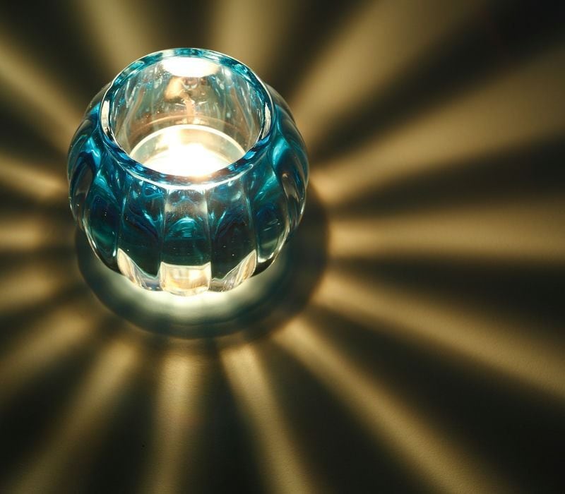 あかりを灯すと、ぽってりと丸いボディとカットから、伸びやかで美しい放射状の光が放たれ、炎のゆらめきに合わせて光の筋も左右になびきます。