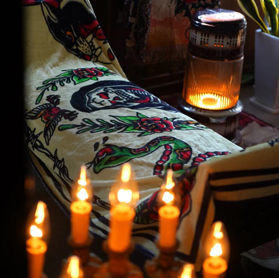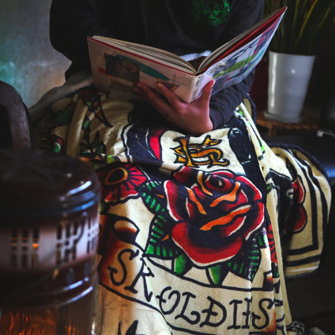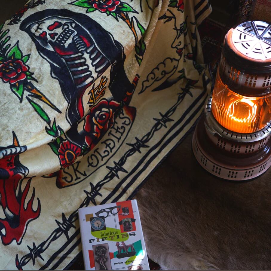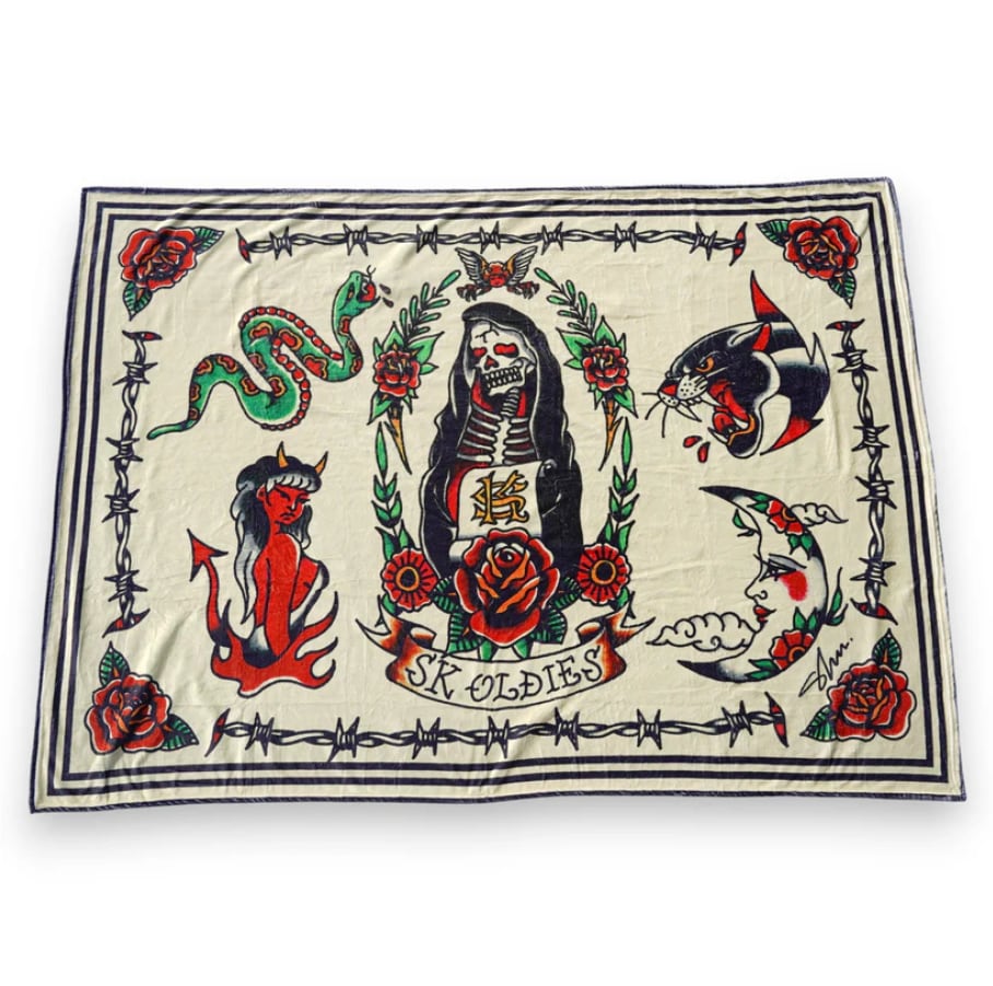 SK OLDIESのSHUが描くNEWシリーズ “REAPER STRIKES” を大胆に落とし込んだスペシャルブランケット。