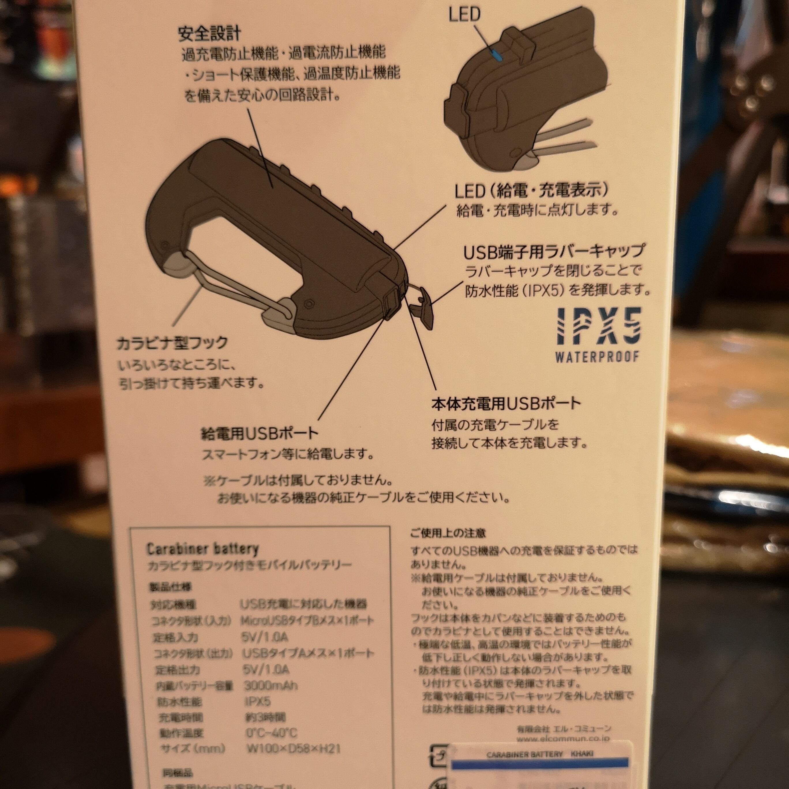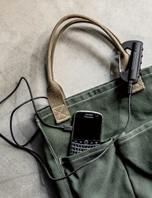 リュックの金具等に引っ掛けられるカラビナ型のバッテリー。