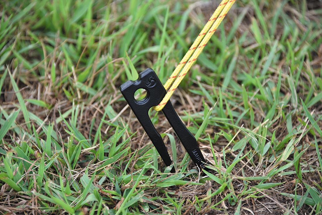 緩めの地面ではペグを横に使えば、より抵抗がかかりやすく抜けにくくなります。