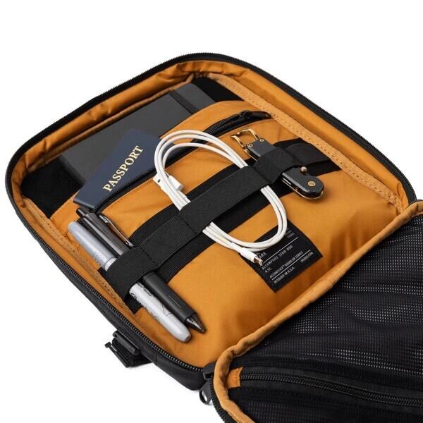 タブレットやノート、充電器などのケーブルや小物をまとめて収納することのできる「STOW MOD」。キャリーベルト付きでハンガーフックも備えており、ホテルや移動中の乗り物で過ごす間に、小物を引っ掛けておくこともできます。「MULE BAG」に追加で装着することも可能で、あらゆる旅に適したアイテムです。